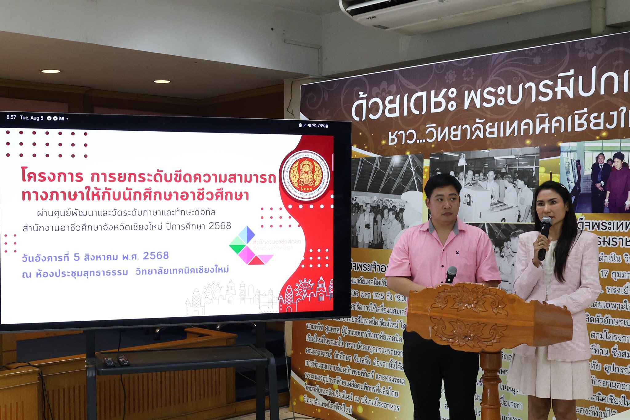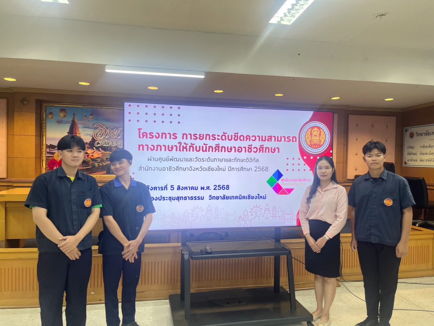 นายวินัย จันทรานาค ผู้อำนวยการวิทยาลัยเทคนิคสันกำแพง มอบหมายให้นางสาววริษฐา เภสัชพิพัฒน์กุล ครูภาษาอังกฤษ แผนกวิชาสามัญสัมพันธ์ นำนักเรียนเข้าร่วมโครงการยกระดับขีดความสามารถทางภาษาให้กับนักศึกษาอาชีวศึกษา ผ่านศูนย์พัฒนาและวัดระดับภาษาและดิจิทัล ณ ห้องประชุมสุทธาธรรม วิทยาลัยเทคนิคเชียงใหม่