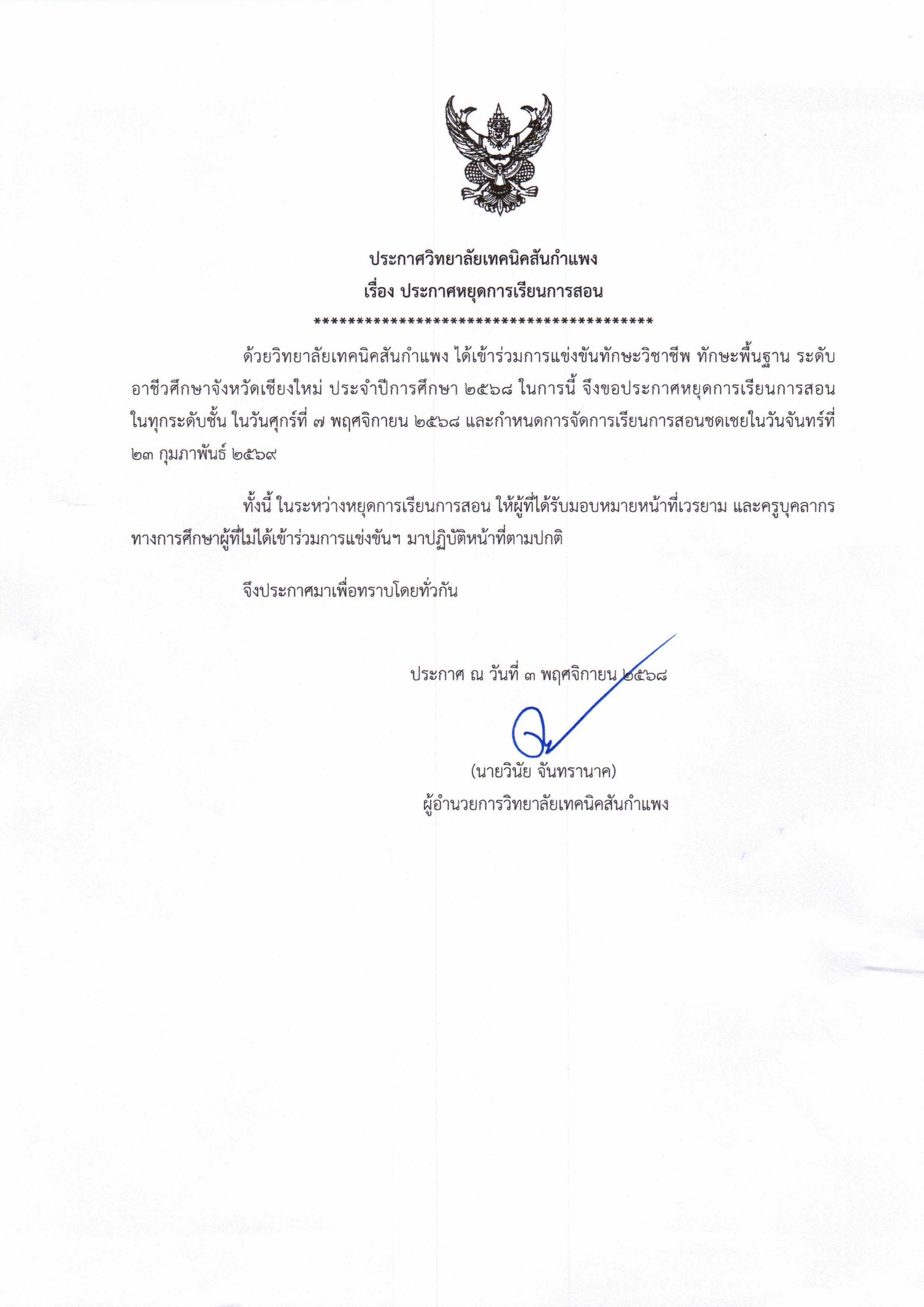 ประกาศหยุดการเรียนการสอน 7 พ.ย 68